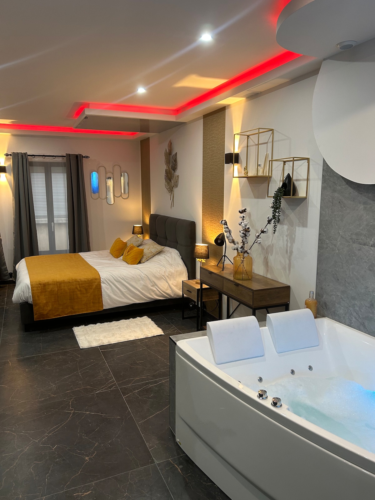 Naša 40 m2 klimatizirana nastanitev Evasion vključuje dnevno sobo s kuhinjo, dnevno sobo in masažno kadjo. Romantična spalnica z zakonsko posteljo in prho z rastlinsko steno. Ponujamo 3 dodatne možnosti: Romantično okolje s svečami in cvetnimi listi vrtnice za 20 €. Gurmansko uprizoritev, ki vključuje romantično uprizoritev + 1/2 steklenico šampanjca + sladke ali slane malenkosti, ki jih je treba opredeliti skupaj na 50 €. Rojstnodnevna uprizoritev za 20 €.