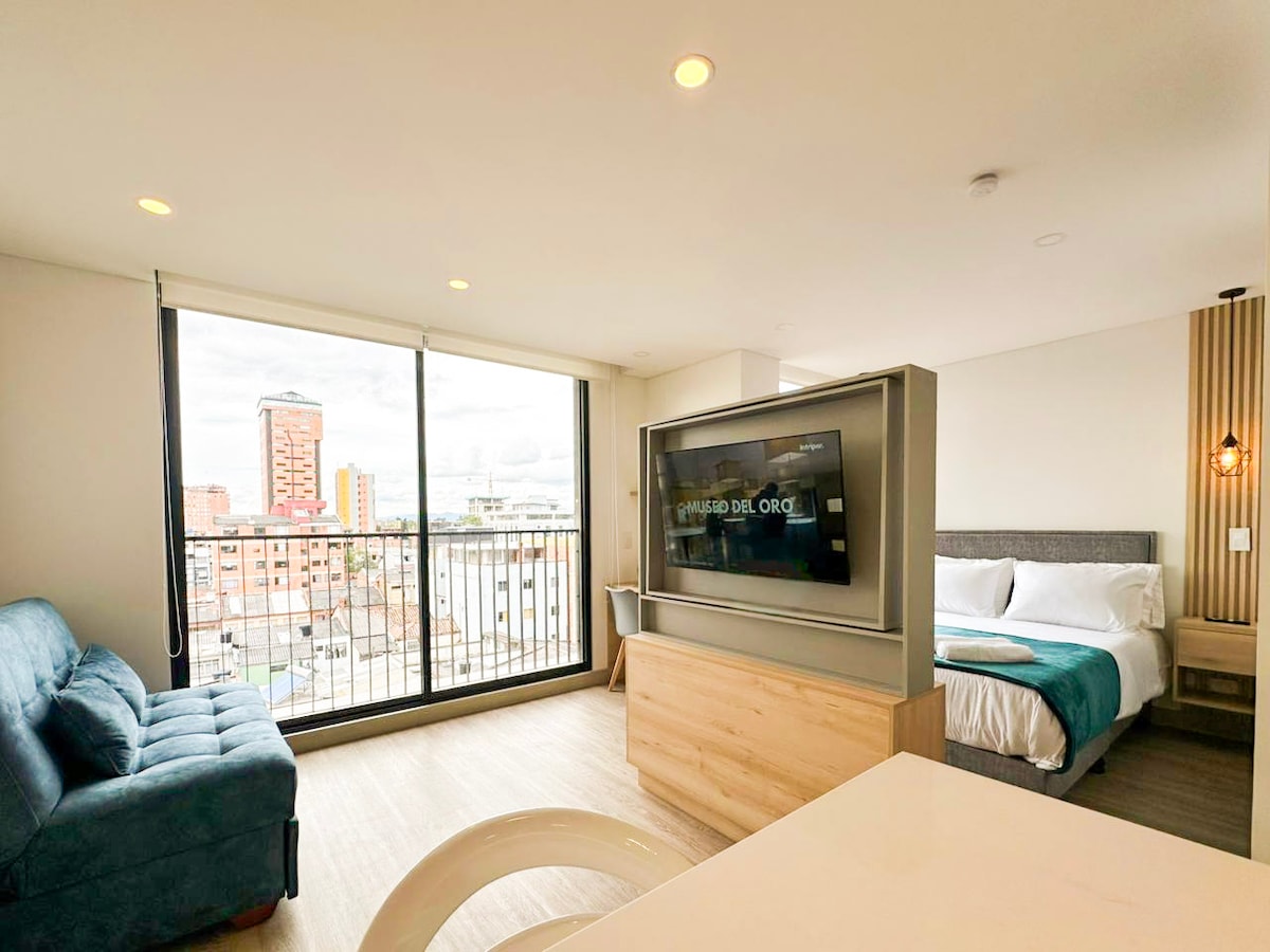 Spektakularno sodobno stanovanje z značilnim dizajnom, zaradi česar je edinstveno na tem območju. Vsaka enota ima udoben balkon. Uživajte na spektakularni skupni terasi s kaminom, žarom in coworking prostorom za popolno doživetje. V njegovi bližini boste našli trgovine, univerze, javni prevoz, restavracije, areno Movistar in stadion. Doživite popolno fuzijo med udobjem in praktičnostjo v najinem prenočišču. ŽAL NIMAMO PARKIRIŠČA.