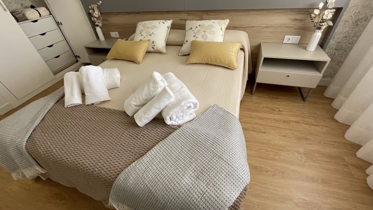 Apartamentos de 1 dormitorio principal + sofá cama de 1,50 en salón. totalmente nuevos y equipados con todo detalle. Cocina completa en cada apartamento, baño completo con ducha. Fibra óptica en cada apartamento y SMART TV E, La situación es en el centro de la localidad, teniendo a unos metros supermercados, bares todas las comodidades necesarias. Zona segura donde podrás aparcar a pié de los apartamentos. Siempre dejamos desayuno de cortesía, café, leche, zumos, bollería etc.