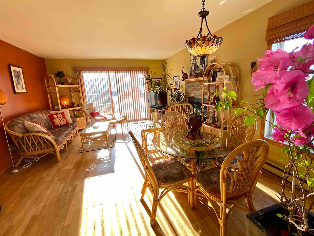 This is your lovely vacation home in the beautiful Eastern Townships area. It's a cozy condo with 1 bedroom of a queen bed and 1 floor mattress in the living room. Perfect for couples, solo travelers and families (with children). Only a couple of mins walking from Lake Memphremagog, and 5 mins driving from Mont Orford Ski Resort. Free WiFi and Free Parking. Wood floor, full kitchen, 1 bathroom/amenities, washer, dryer, dishwasher, wood burning fireplace, big terrace and BBQ.