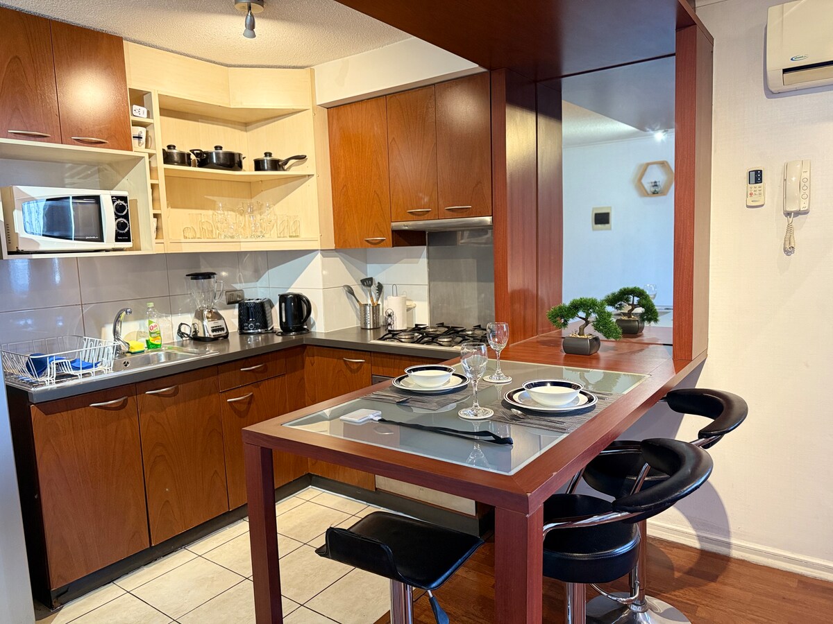 Dobrodošli! Uživajte v bivanju v popolnoma novem stanovanju, ki je zasnovano tako, da se sprostite po celodnevnem raziskovanju mesta. Nahaja se v osrčju Santiaga, le nekaj korakov stran od podzemne železnice, avtobusov, trgovin, restavracij, muzejev in najboljših razgledov na mesto. Paseo Bulnes, Almagro Park, La Moneda, Cerro Santa Lucía, Lastarria/Barrio Italia. Ima vse, kar potrebujete: udobno posteljo, popolnoma opremljeno kuhinjo, Wi-Fi in veliko opreme. Vse, kar potrebujete za raziskovanje Santiaga.