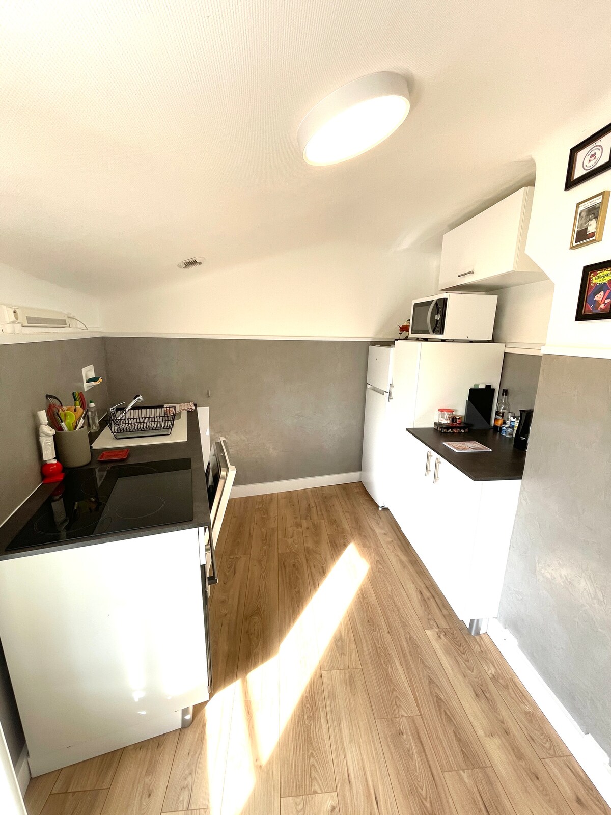 Logement/studio meublé 1 seule pièce), tout équipé, 17m² au rez de chaussée d'une maison, à 10 min en transport du centre Lyon. Lumineux, tout confort, refait à neuf par l’architecte propriétaire. Literie confort, 1 lit double de 160cm. Espace cuisine/bar/salle d’eau. Accès direct terrasse+jardin (100m² à usage locataires). Lave-vaisselle, four/micro-ondes, grand réfrigérateur, plaques électriques ATTENTION : WC séparés, sur le palier. A usage unique locataires. Wifi gratuit