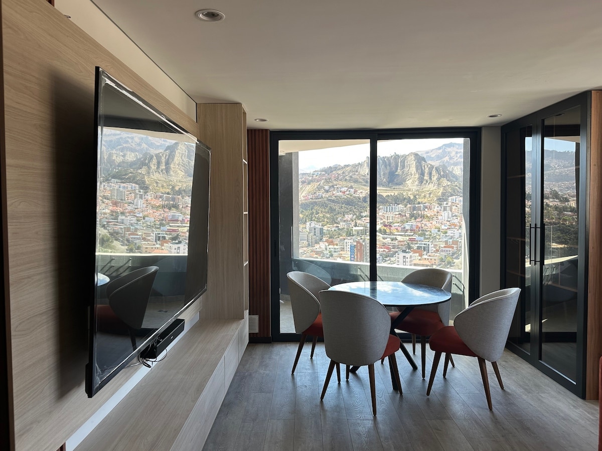 Novo stanovanje, prostorno, visoko nadstropje in zelo svetlo. Odlično za počitek ali poslovna potovanja. Ima eno spalnico z garderobno omaro, dve kopalnici, opremljeno kuhinjo in veliko dnevno-jedilnico s čudovitim razgledom. Nahaja se na varnem območju, v bližini kavarn, restavracij in supermarketov, z odlično povezavo z javnim prevozom. Če se raje sprehajate, je kot nalašč za enostavno gibanje. Uživajte v La Pazu z udobjem, slogom in toplino. Udoben prostor vas čaka.