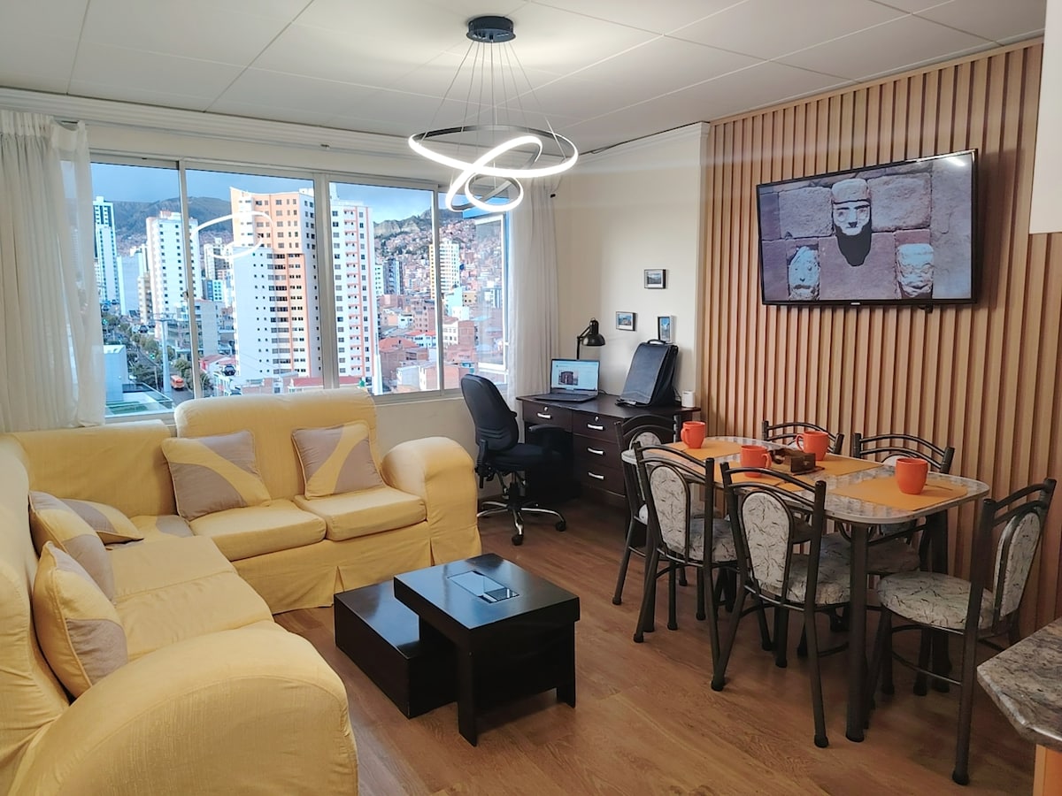 Cozy apartment in bohemian Sopocachi. Incredible view of Plaza Abaroa, steps from markets, pubs, and restaurants. Remote Work Ready: features a dedicated desk and exclusive high-speed WiFi for seamless video meetings. Centrally located, 10-min walk to Yellow/White Cable Car lines. The building offers 24/7 security and porters in a very safe area. The perfect spot for a productive and comfortable stay in La Paz!