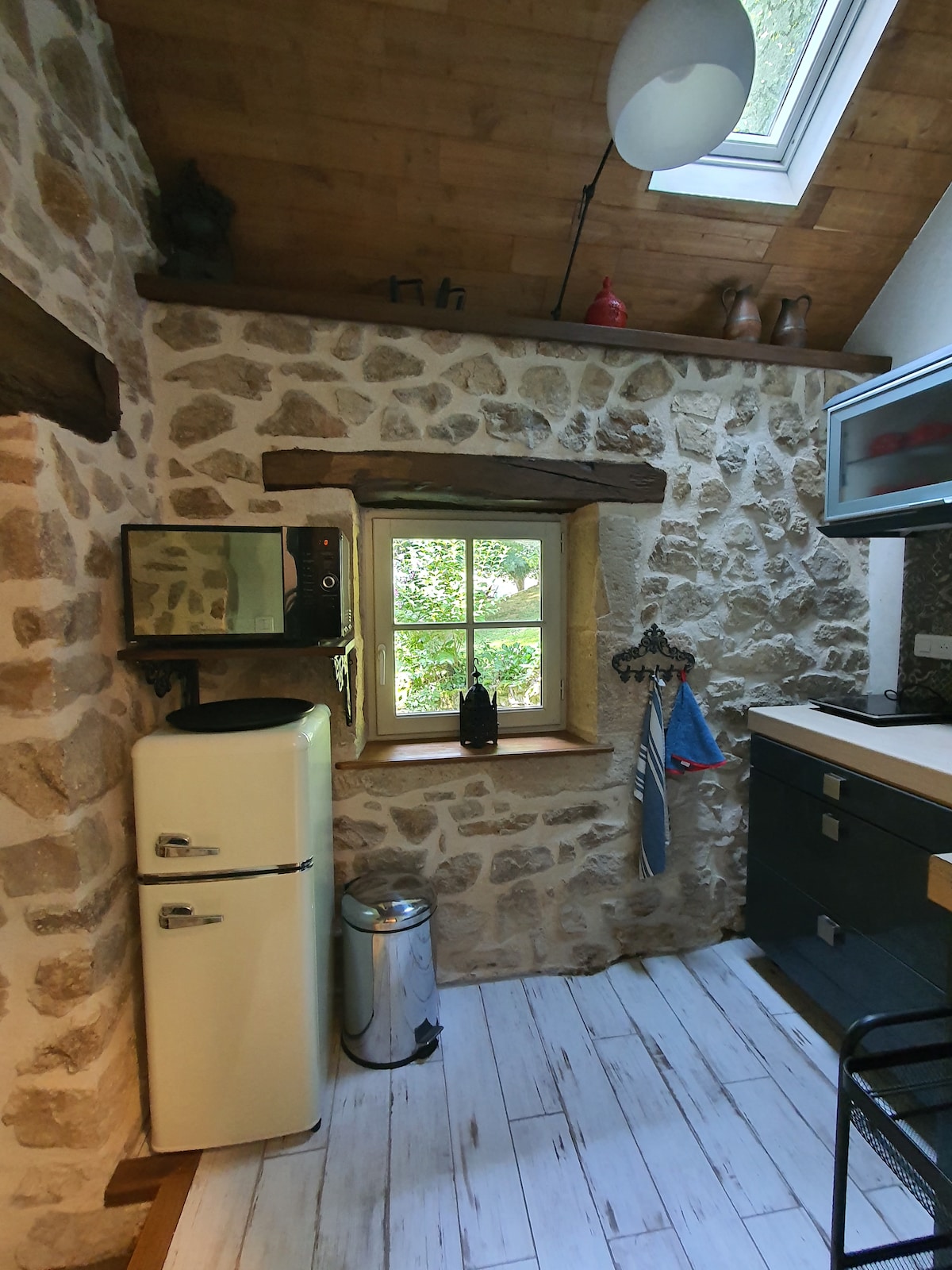 Cool, comfortable and spacious (90m2) home on 2 floors. Large kitchen , lounge and terrace on street level and fabulous 1 double bedroom open plan room on the 2nd floor. A converted grange perched on a mountain in a medieval village 16 minutes from the A6, this peaceful home makes an ideal stop over for holidays in the Alps or south of France. Please note - there is a studio apartment with its own entrance on the lower ground floor - rented separately.