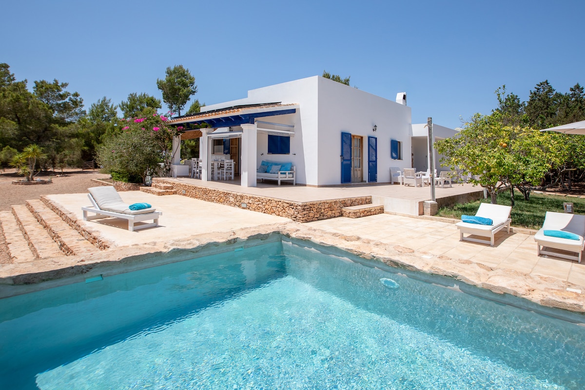 Can Guasch es una preciosa villa ubicada entre Sant Francesc y Cala Saona. La casa dispone de 4 habitaciones, una con cama doble y las otras con camas individuales, cocina y tres baños. La casa cuenta con una zona exterior con piscina, barbacoa y porche donde disfrutar de agradables cenas. Ideal para familias y grupos de amigos que desean que el alojamiento sea una experiencia más de las que gozar en la isla.