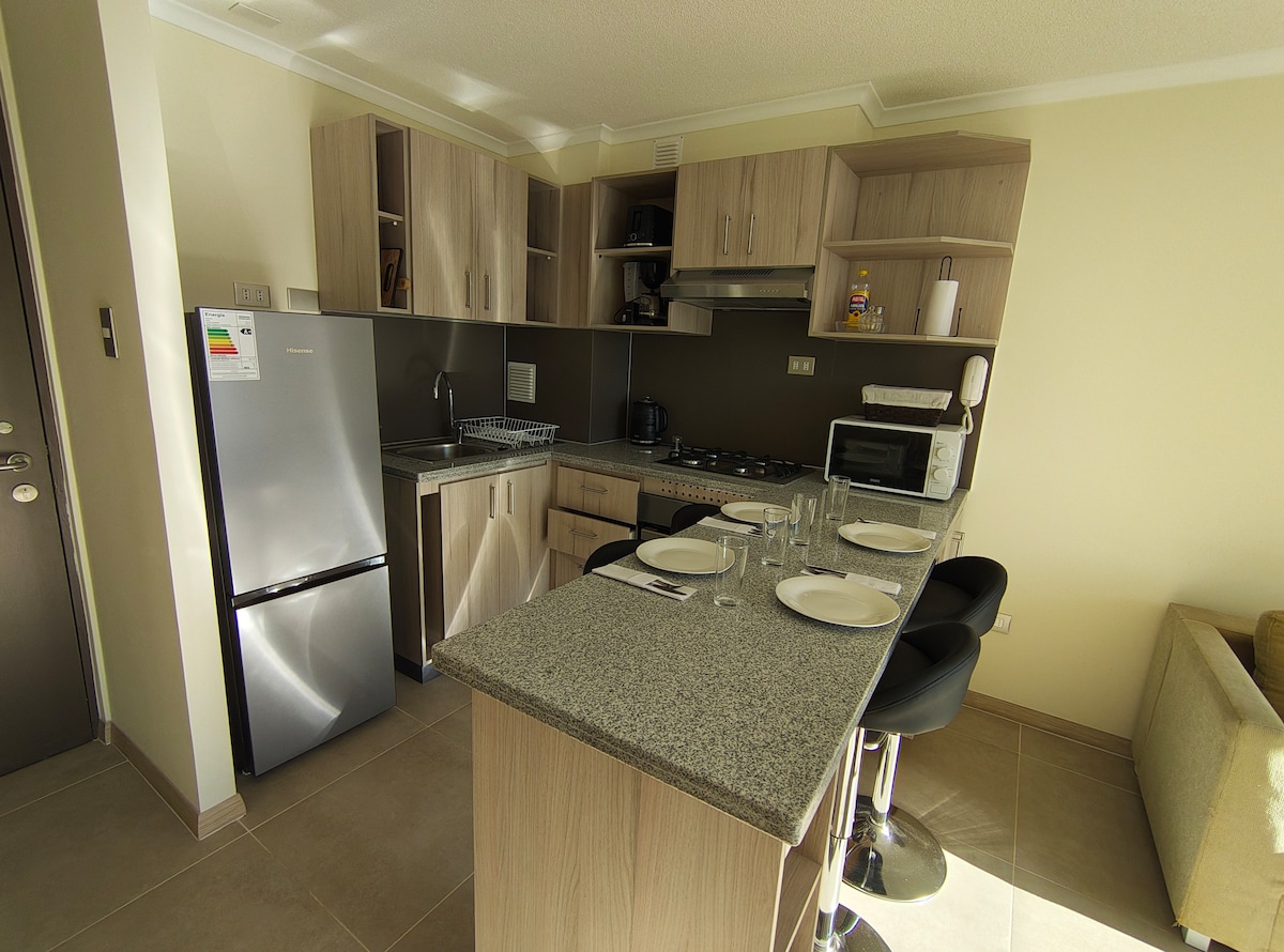 Disfruta de una excelente ubicación a una cuadra de la playa y a pasos del casino Enjoy. Cerca de restaurantes, cafeterías y bares ubicados en la costanera de La Serena. El condominio rodeado de áreas verdes, cuenta con piscina, quincho, estacionamiento, ascensor y conserjería 24 hrs. Completamente equipado, el departamento cuenta con 2 habitaciones, una con cama matrimonial y la otra adecuada como espacio de trabajo con escritorio. Sábanas y toallas incluidas. Futón en la sala. Smart TV y WiFi.