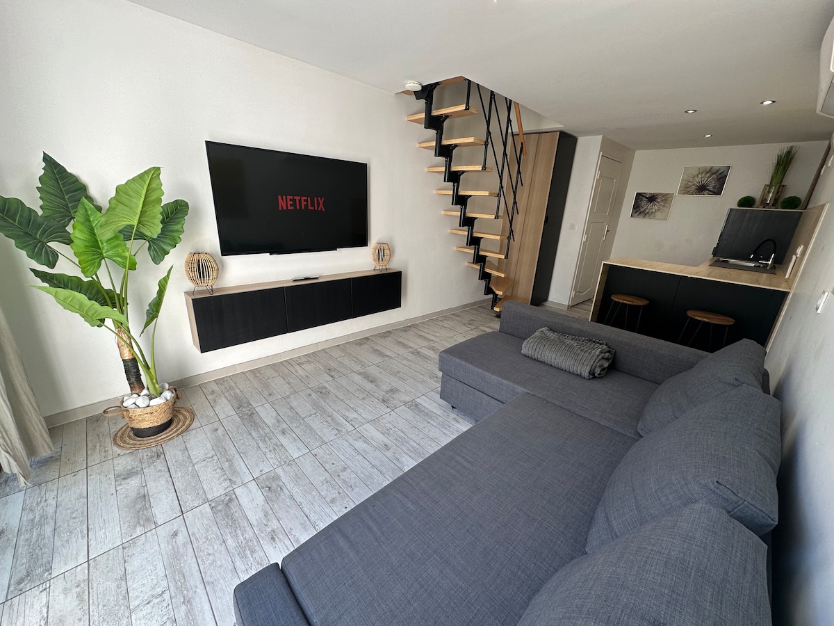 Patio de l'Arena ✨ 2-sobno sodobno prenovljeno stanovanje s čudovito teraso, obrnjeno proti jugu 🌞 in zasebno garažo. Uživajte v prefinjenem in svetlem kokonu le nekaj minut stran od🎯 stadiona Groupama, arene LDLC, Eurexpo in središča Lyona. Spalnica z zakonsko posteljo (Queen), dizajnerska dnevna soba z opremljeno kuhinjo, elegantna kopalnica. Popolnoma mirno 🌿 in vrhunsko udobje za profesionalno bivanje, koncert ali oddih v Lyonu. Prenočišče, ki ga je podpisala Villa Gaia.