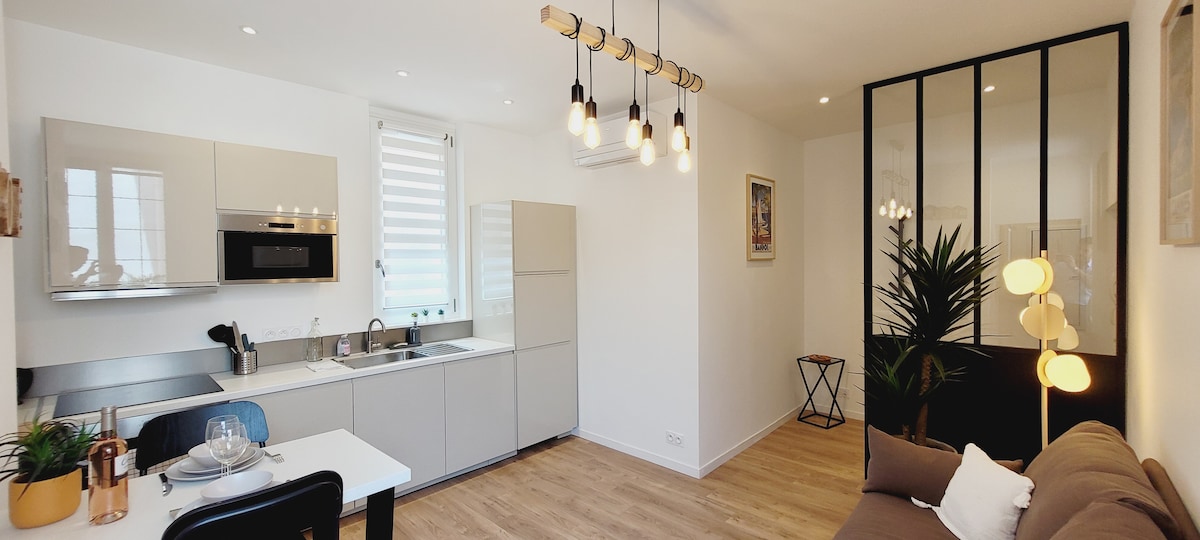Appartement T3 DESIGN Calme et lumineux, entièrement refait à neuf. Au 2ème étage d'une petite résidence. Cuisine équipée, Wifi, linge de maison fourni ( draps, serviettes de toilettes). A disposition café, thé, pour le petit déjeuné et pour le repas les condiments. La situation géographique permet de circuler à pied dans le centre ville (boutiques, restaurants, ciné..) proche du parc Rambot, des restaurants, la mairie. Mon logement convient aux couples, aux voyageurs d'affaires et les familles