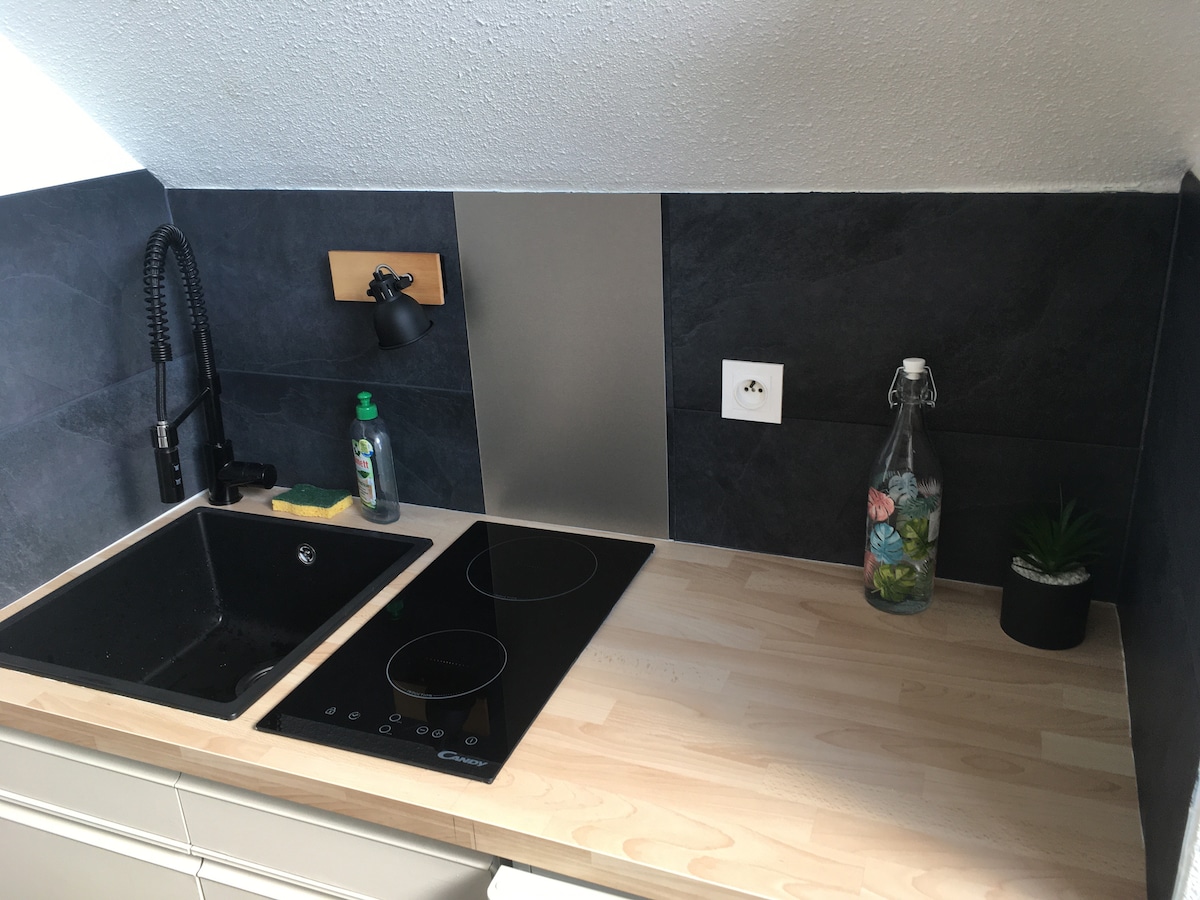 Očarljiva garsonjera v velikosti 22 m2 z 1 teraso, obrnjeno proti jugozahodu, ki se nahaja v 3. in zgornjem nadstropju mirnega stanovanja (obiskovalci zabave se vzdržijo). Dnevna soba vključuje 1 clic-clac (kakovostna posteljnina z vzmetnico Dunlopillo), 1 mizo + 4 stoli, 1 kuhinjsko nišo (električne kuhalne plošče), 1 hladilnik, 1 mikrovalovno pečico, 1 aparat Tassimo, 1 grelnik vode, 1 opekač kruha, 1 TV in kopalnico s podstrešno kadjo (ni mogoče stati) Na voljo sta 2 kolesi (glejte fotografijo)