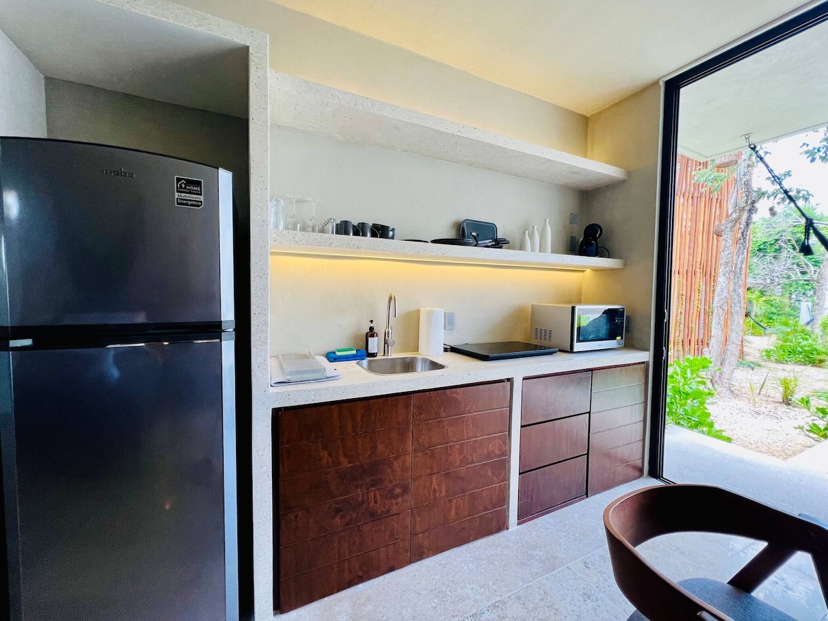Unveil contemporary luxury at our new jungle condo. With expansive windows and double-height ceilings,this unit is bathed in natural light, creating a unique and inviting atmosphere.Relax in the king-size bed overlooking the social area or step outside to your private swim-up pool.Take the elevator to Tulum's #1 rooftop terrace for stunning views.Enjoy 200 mb internet and a central location between downtown Tulum and the beach,ideal for exploring shops, dining, and the beautiful beaches of Tulum