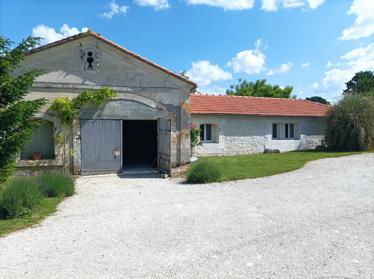 Velika hiša charentaise, ki lahko sprejme do 12 gostov, ki so obrnjeni proti jugu, prostorna, prenovljena. Kamin v veliki kuhinji. Zaprt vrt. Mirno, sredi narave za počitnice z družino ali prijatelji ali skupino. morda je primeren za osebe z omejeno gibljivostjo (italijanska prha, stranišče v pritličju ) 25 minut od konjaka in Angoulêmeja. 5 minut od majhnih trgovin, 10 minut od Barbezieux, Chateauneuf sur Charente in Segonzac.