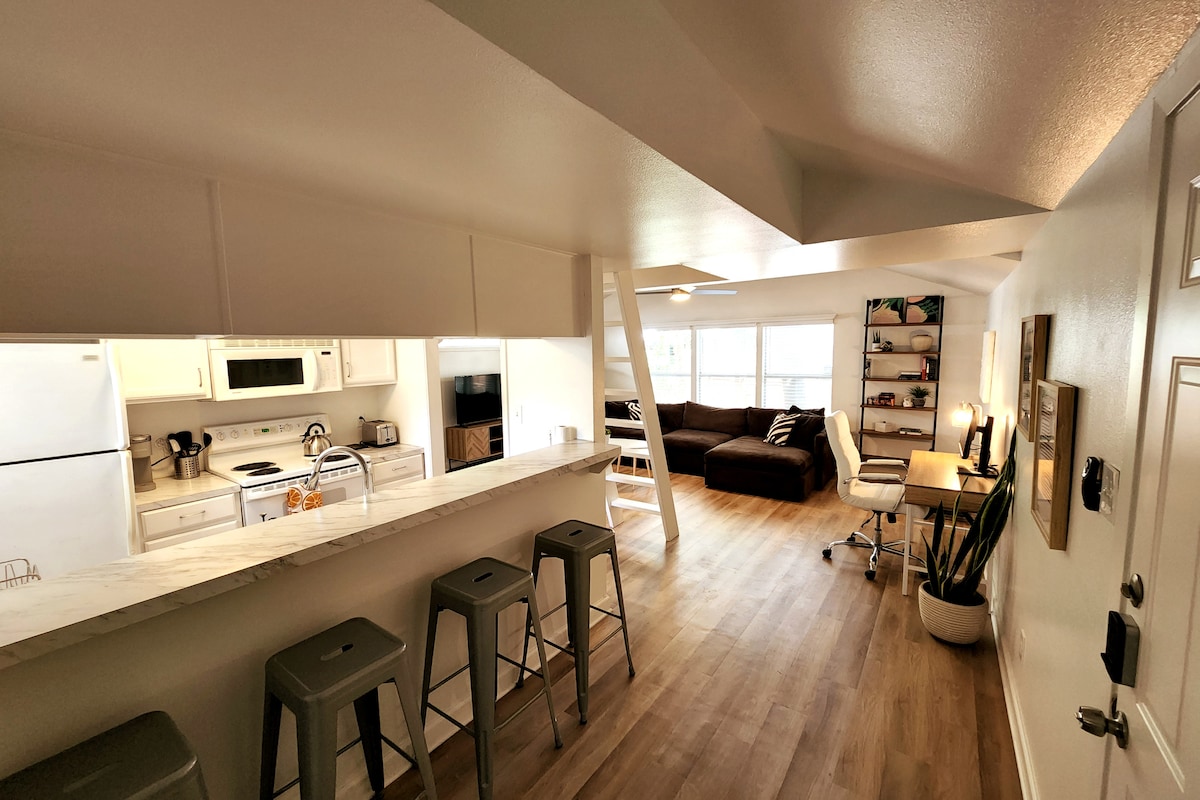 Fully remodeled, centrally located 1BR with a private alleyway entrance and parking. Loft bedroom accessed via a ladder-like stairway gives the space an open feel. The comfortable sectional offers a plush place to chill while watching TV or a place for a third guest to sleep. The remote work setup includes a high-end monitor and wireless peripherals accessible by a USB-C hub. Pets are welcome. New washer and dryer. Walkable neighborhood convenience only 10 mins from UT or 15 to downtown.