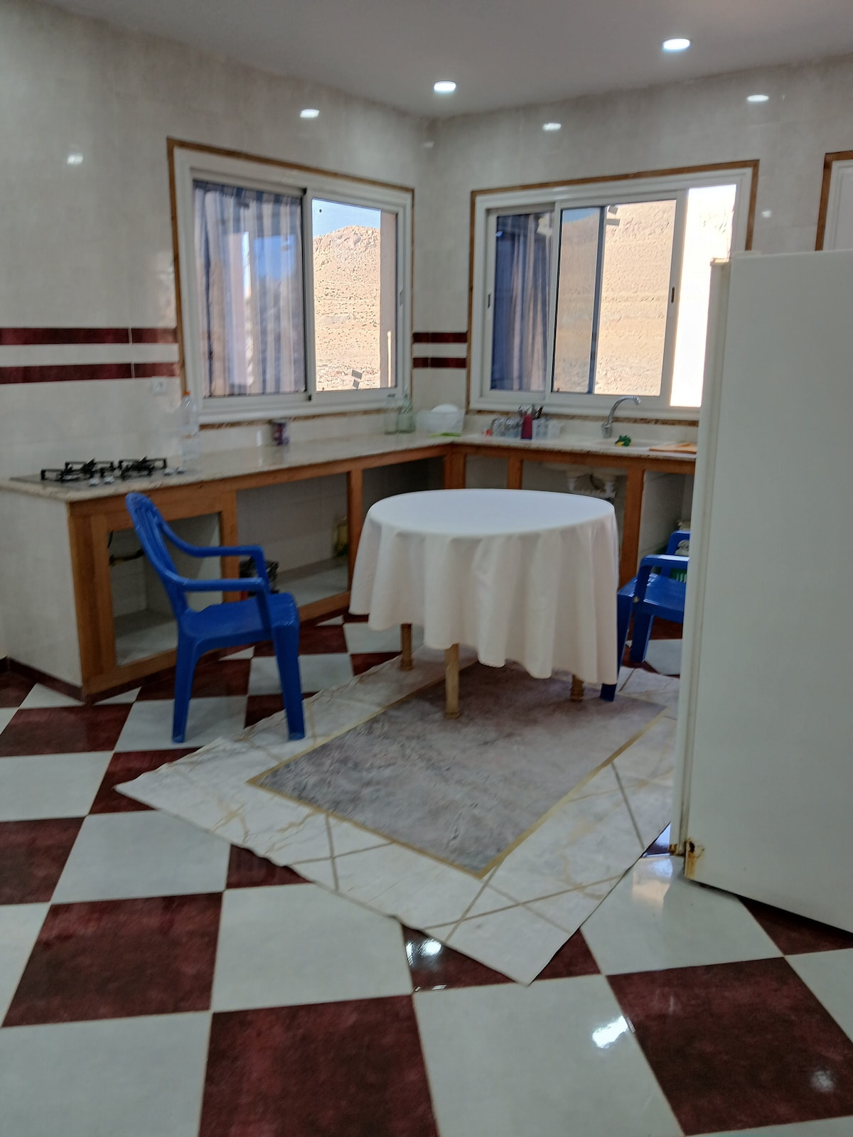 La Maison d'hôtes Houria offre 5 chambres spacieuses (3 lits chacunes, modulables en lits doubles) avec sanitaires privés et douches à l'italienne. Profitez d'une cuisine équipée, d'un hall convivial, d'une piscine avec espace détente, de terrasses, d'une salle polyvalente au décor traditionnel, d'aire de stationnement sécurisée, d'une petite palmeraie et d'une vue dégagée sur les champs pour contempler de merveilleux couché et levé de soleil