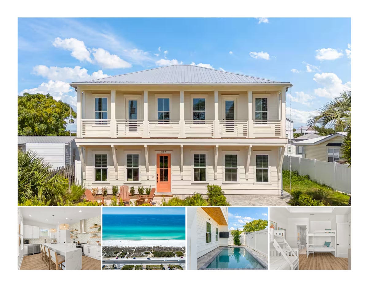 Palms by the Beach nudi razkošen domač občutek z bazenom, zunanjo prho, zasebnim dvoriščem, 7 minut hoje/3 minute vožnje do plaže. Primerno za izlet z družino ali prijatelji. Popolna lokacija! Manj kot 10 minut vožnje do parka Pier, 8 minut do plaže Rosemary in 30A. Do Destina je tudi kratka vožnja. Počutite se kot doma s popolnoma opremljeno kuhinjo. Udobne spalnice in zunanji prostor z jedilnico in prostorom za žar. Vključena sta 2 tricikla za odrasle in 3 otroški skuterji. 4-sedežni voziček za golf, ki je na voljo za najem 85 $ na dan!