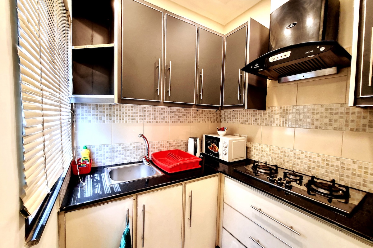 Očarljivo stanovanje 2 BR v bližini Gulberga v Lahoreju. Bivajte v središču mesta v našem elegantnem popolnoma opremljenem stanovanju 2 BR, ki je le nekaj minut stran od glavnih znamenitosti. Vsaka spalnica ima kopalnico, prostor pa vključuje klimatsko napravo, pametno LED in popolnoma opremljeno kuhinjo s hladilnikom. Udobno stanovanje, ki je idealno za družine, pare ali poslovne popotnike, ponuja udobje in priročnost za vaše bivanje. Rezervirajte zdaj in uživajte v sproščujočem oddihu z vsem, kar potrebujete, na dosegu roke.