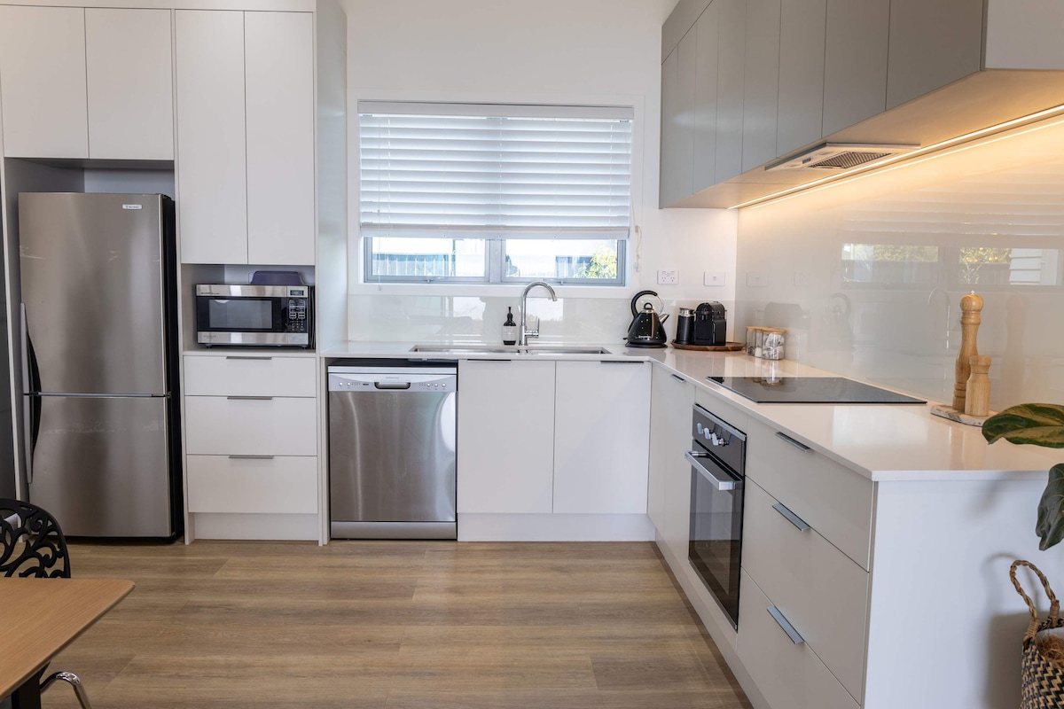 You won’t want to leave this charming, one-of-a-kind place. Right on the edge of the beautiful lake Rotoiti. Relax to the sound of the lapping waves and native bird song. Bifold doors open onto your private deck right by the waters edge. Park your boat/jet ski on the jetty ready for your next adventure AND you can even bring your fur child with you. Outside bath is "rustic" Outstanding bush walks, water falls, hot pools, glow worms and only 20 mins from Rotorua. We wash your dishes!