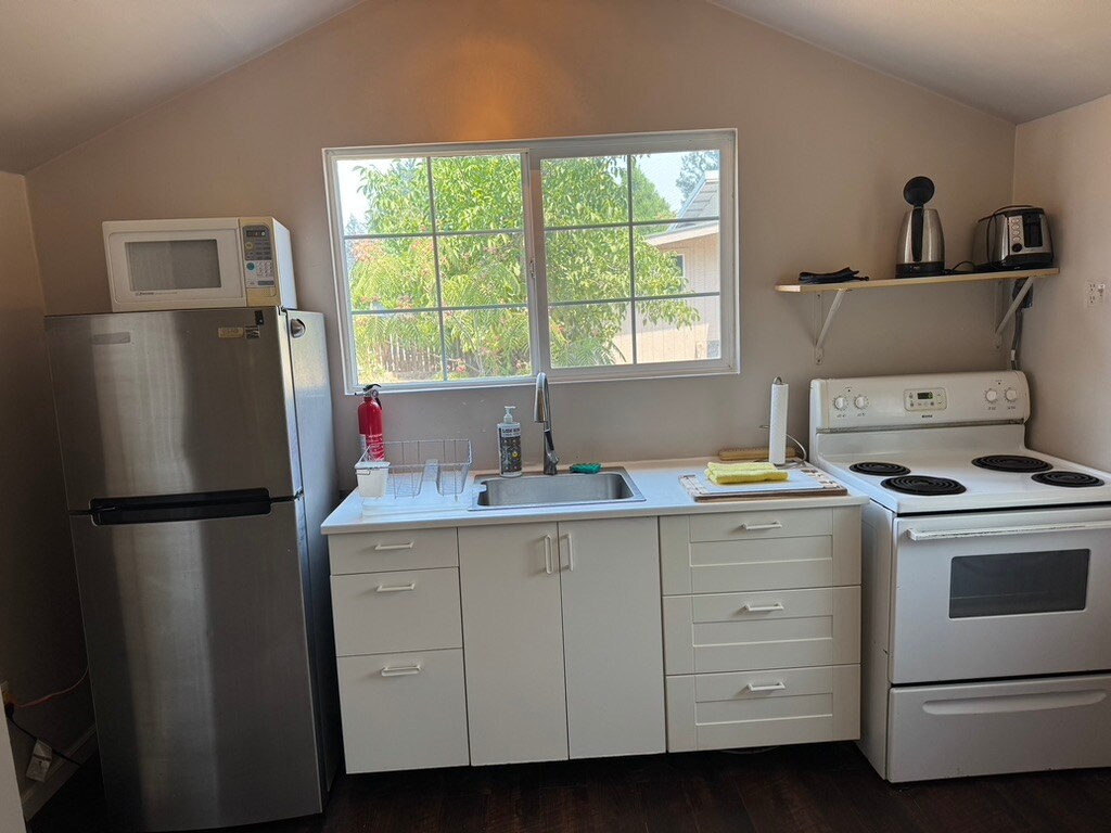 From the gorgeous kitchen to the charming bath, a lot of thought has gone into the guest's experience! With amazing views of Cobb Mountain and Mount Saint Helena, this studio offers a peaceful place from which to explore the area. The deck is very large. The comfortable seating are is a great place to relax or watch tv. The kitchen is well stocked with all the dishes, cookware and small appliances needed for cooking. Extended stays are welcome!