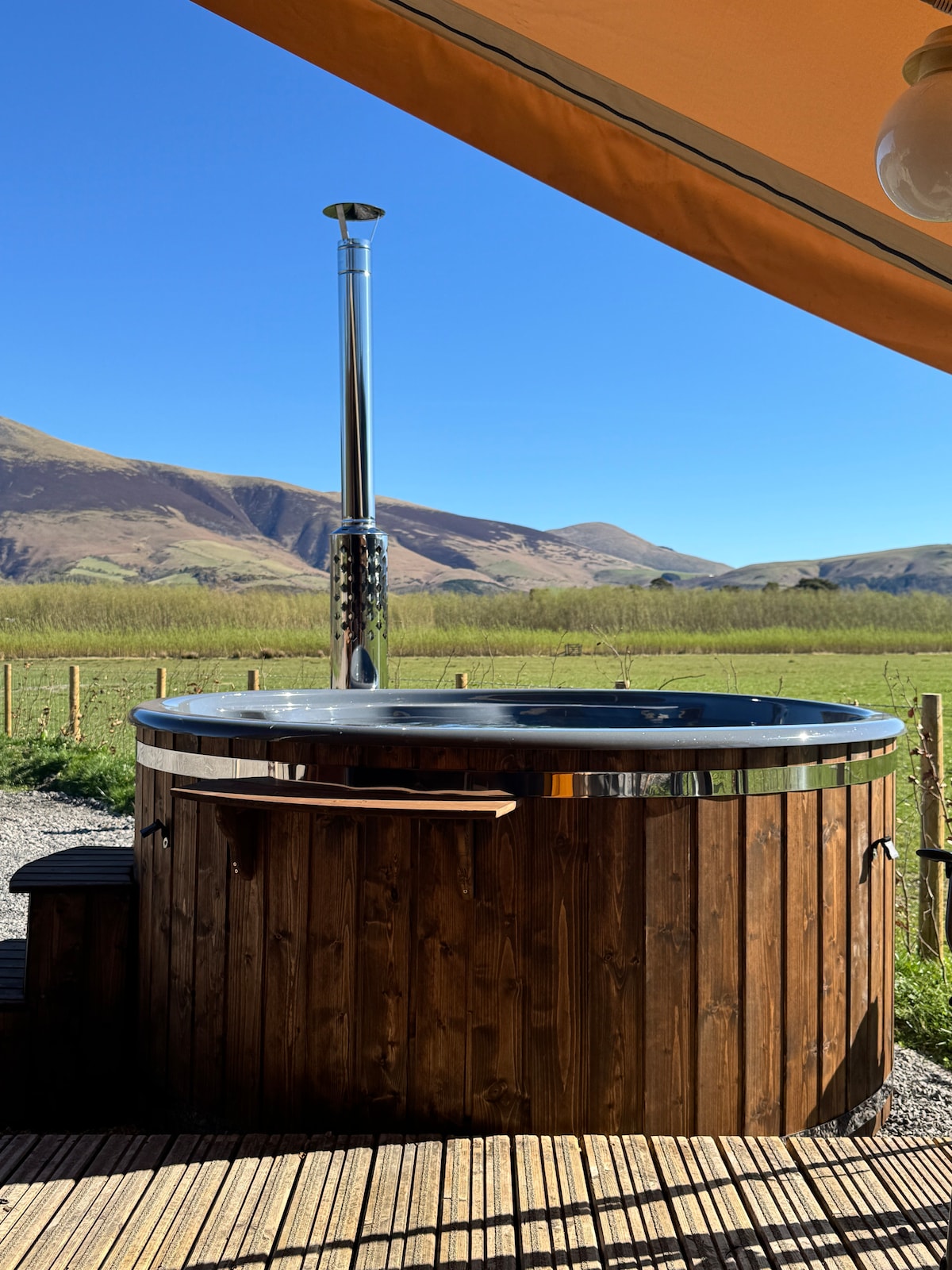 THE ultimate hassle-free camping/ glamping getaway in the heart of the Lake District! Inside, you’ll find real beds, the kitchen area comes complete with all the essential equipment (now including frying pans) a cozy fire-burning stove adds a touch of warmth and charm to the space. Unwind in your hot tub, taking in the unobstructed views of the fells. Free Wi-Fi, and located opposite the shower & toilet block. Close to Keswick