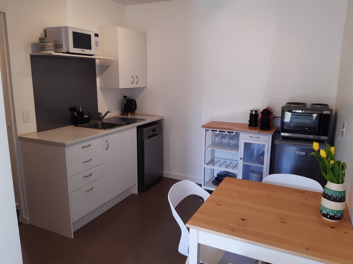 Sodoben studio s kuhinjo, kopalnico in sušilnim prostorom. Ta centralno nameščena, samostojna enota se nahaja v mirni ulici na posestvu Lake Hayes Estate in le 25 minut od smučišča Coronet Peak in približno 35 minut od smučišča Cardrona in izjemnih smučišč. Samo 10-15 min vožnje do vinske dežele Arrowtown, vinske dežele Gibbston Valley ali 20 min do Queenstowna. Parkirišče je na voljo v sklopu nastanitve. Na voljo so mleko, čaj in kava.