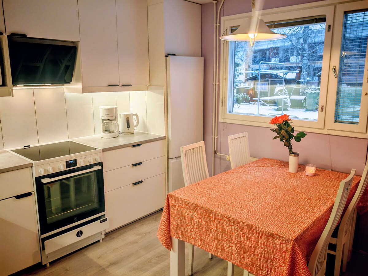 Na odlični lokaciji v središču Saariselke, blizu vseh dejavnosti in storitev, se nahaja udobno in prostorno stanovanje v vrstni hiši, 54 m2 + podstrešje in spalnica v nadstropju z lastnim straniščem. Vse spalnice gledajo na gozd. Smučarske proge in izhodiščne točke za naravne/pohodniške poti so oddaljene 200 metrov. Čiščenje, posteljnina in brisače so vključeni v ceno.