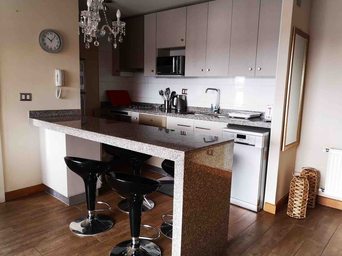 Novo stanovanje s strateško lokacijo bo zelo enostavno načrtovati obisk. Blizu restavracij, parkov, obale in središča mesta. Stopnice od hriba Phillipi in čudovite plaže Lake Llanquihue. Z zasebnim in pokritim parkiriščem. Dnevna soba in jedilnica z delnim pogledom na jezero, opremljena kuhinja, dve spalnici, glavna spalnica, centralno ogrevanje, pametna televizija, Wi-Fi, glasba z bluetoothom. Popolnoma opremljen z vsem, kar potrebujete za prijetno bivanje.