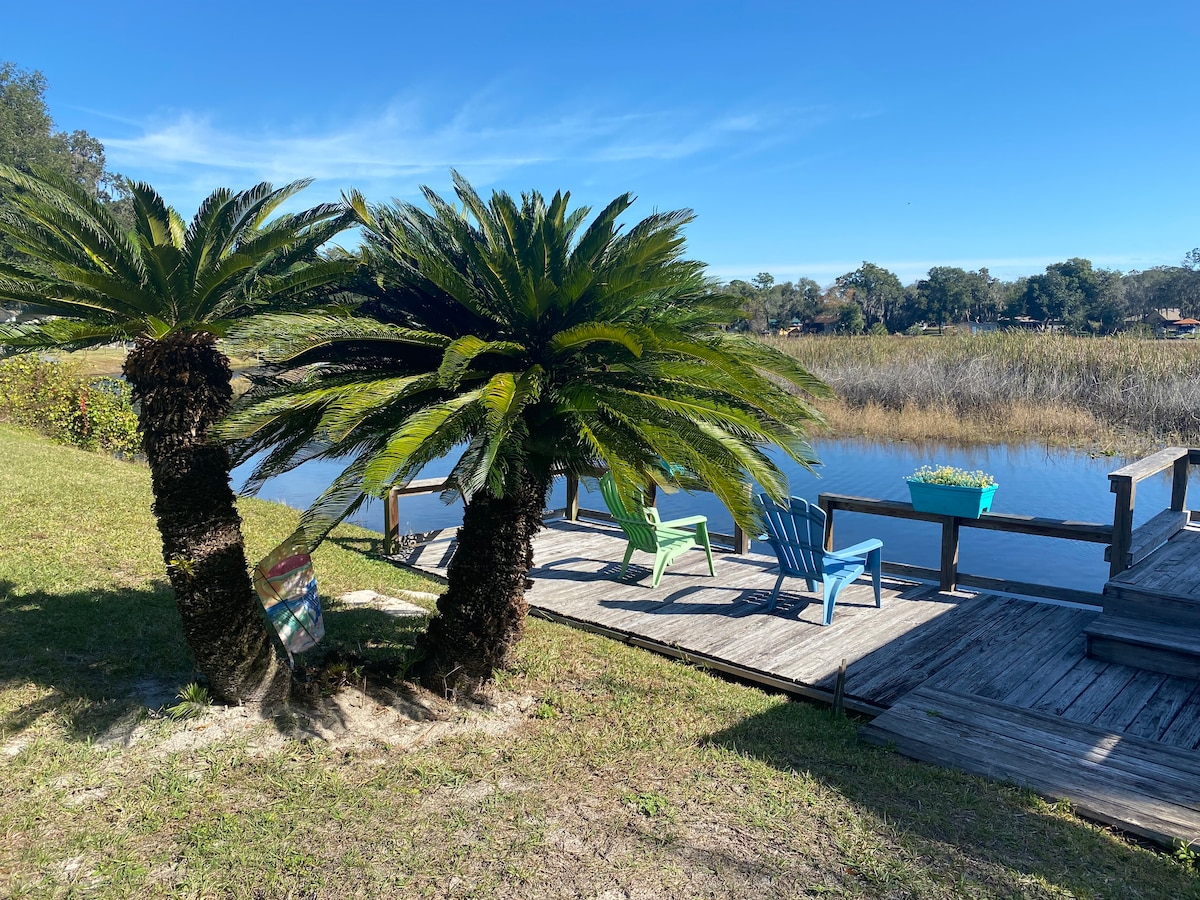 Čarobno okolje ob jezeru. Nahaja se v središču mesta na obali jezera Hernand - največje jezero v 25 miljah verige jezer, znanih kot veriga jezer Tsala Apopka. Vaš umik ob obali vključuje: spominsko peno Queen, Wi-Fi, TV, Bluetooth stereo, polno kuhinjo, teraso, žar, 2 brezplačna kajaka in kanuja za raziskovanje, pomol, ognjišče, samodejno varnostna vrata. Ta osrednja lokacija je kot nalašč za zabavo v bližini - Inverness 10 min. Crystal River 15 min, Ocala, Rainbow River ali Homosassa 20 min