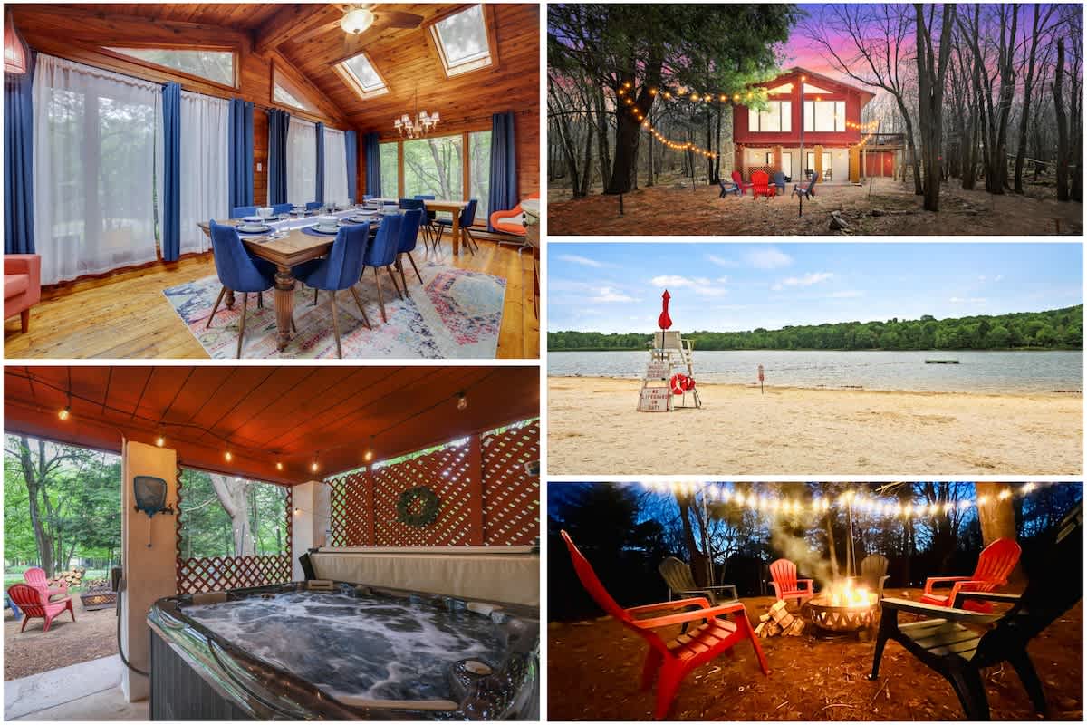 Uživajte v... Pogled na✩ jezero in plažo ✩ Nasproti igrišča, odbojke, košarke ✩ Lastna ognjišča in drva ✩ Posteljnina in brisače ✩ Žar in propan ✩ Popolnoma opremljena kuhinja Umivanje ✩ telesa, šampon, balzam ✩ 2 otroški posteljici, otroški stol za hranjenje, otroška posteljica, otroška kad Miza ✩ za biljard, miza za namizni nogomet in druge igre ✩ Blizu nakupovanja, igralnice, Pocono Raceway ✩ Ribolovni prostor 2 min hoje ✩ Udobno do dva plinska kamina - prva in nižja raven ✩ Mins to Jack Frost & Big Boulder (snežne cevi in smučanje)