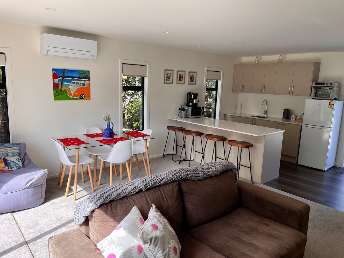 V priljubljenem počitniškem zatočišču zaliva Acacia Bay je to odlično izhodišče za skok v vodne/pohodniške pustolovščine ali pa se preprosto skrijete na kavču z malo Netflixa. Jezero je tik za vogalom (dobesedno!) in veliko je za videti in narediti. Vaš prostor je na novo prenovljen s kuhinjsko nišo, okusnimi kosmiči, udobnimi dodatki, kot so igre, knjige, Wi-Fi in Chromecast. Vaše zatočišče je 6 minut vožnje z avtomobilom do središča mesta, 3 minute hoje do jezera, 1 minuto hoje do lokalnega puba in trgovine.