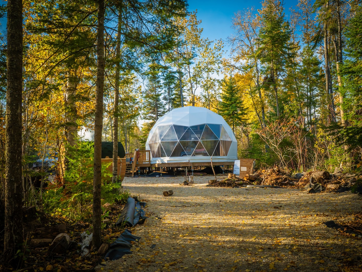 This off-grid 4 season glamping dome cabin is located on a beautiful 20 acre property at a 10 min drive from the shores of Lake Winnipeg and 5 mins away from Gull Lake. Enjoy walking on our forest trails, have a soak in our wood-fired hot tub, take our inflatable boat out for a paddle, or go explore the countless hiking trails nearby. Located just off a groomed snowmobile trail, this is a perfect home base for snowmobilers, ice fishermen and cross-country skiers in the winter time.