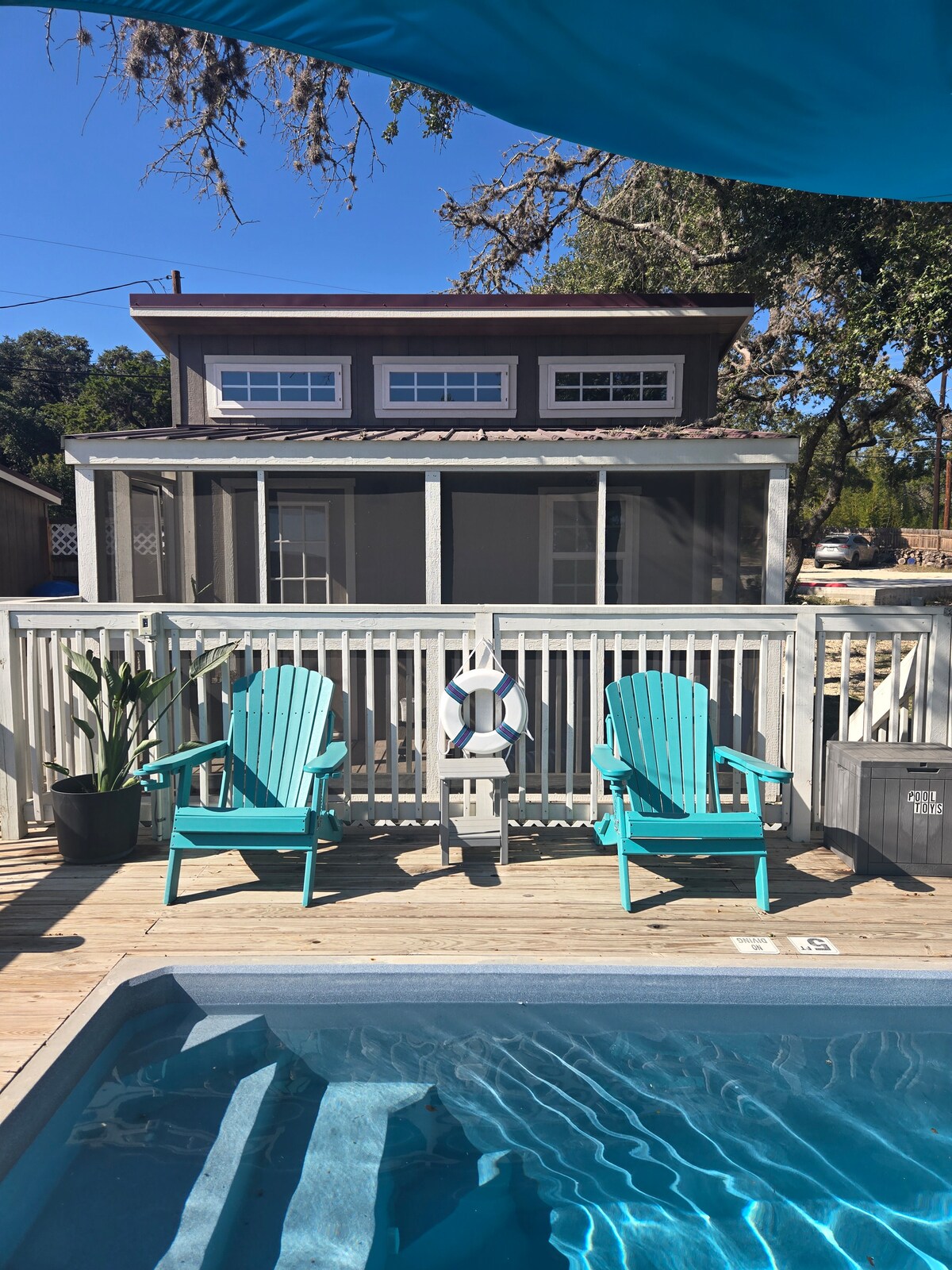 This Tiny Cabin is located in the Texas Hill Country, Bandera TX. Come enjoy our secure homestead with goats, hens, ducks and the family pets, 5 dogs and 1 cat. The homestead is on over 5 acres in the "Cowboy Capital of the World". Just 8 minutes to town with lots of live music, BBQ, southern food restaurants and plenty of small-town shopping of boutiques, antiques and more. You can sit by the river or take a stroll down Main Street. The above ground pool is 33 ft round, behind the main house.