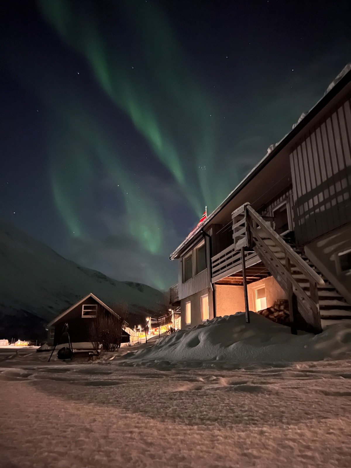 Ta mini-hiška za goste ima najlepši razgled neposredno iz vaše kuhinje in okna spalnice. Ker ni uličnih luči, je to idealen kraj za opazovanje Aurore in sproščujoč zasebni oddih na Arktiki. Živiva v soseski s 6-letnim sinom in mačko. V službi smo od 8.00 doma od približno 16.30 in ob vikendih. Storitve na lokaciji: EV charging 400kr/ Private transfer 500kr/Hot tub 1200kr or 100 € for 2 days/Sauna 500kr or 40EUR per use (cash only)