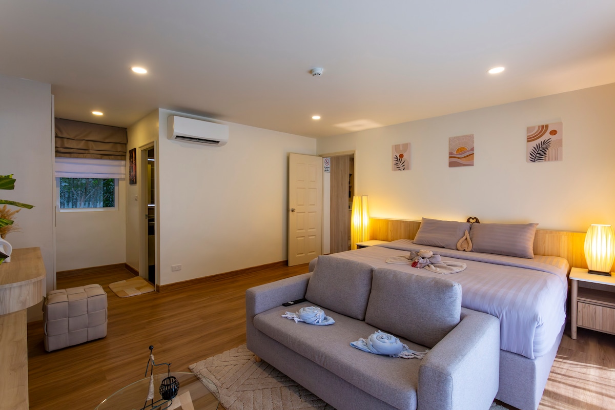 Sodobna garsonjera z veliko zakonsko posteljo, pametno televizijo in elegantnimi mikrocementnimi površinami. Vse je popolnoma novo. Uživajte v bazenu, telovadnici, savni, parni kopalnici in spa-sprejemski opremi v stanovanju. Do plaže in ribiške vasi se lahko sprehodite peš. Idealno za digitalne nomade ali pare, ki iščejo udobje, slog in priročnost na Koh Samuiju.