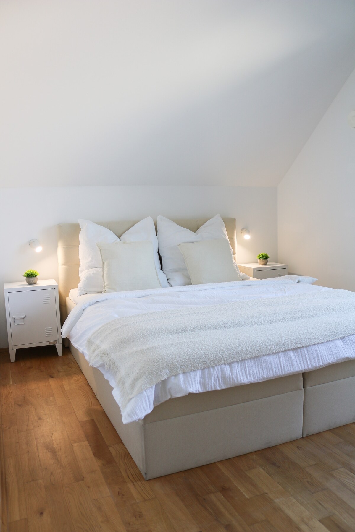 Klimatizirano, sodobno stanovanje/podstrešje v Hannovru-Langenhagenu. 🌟 📐 Prostorno prenočišče s 89 m² za največ 5 gostov s fantastično kuhinjo, strešnimi terasami in masažno kadjo z ogrevanjem, ki je na voljo skozi vse leto. Velika okna zagotavljajo veliko naravne svetlobe v odprtem bivalnem prostoru. 📍 Osrednja, a mirna lokacija: 8 min do letališča in 20 min do sejmišča. 🛒 Vse (nakupovanje, kino, restavracije, zdravniki) je na peš razdalji ali pa je zlahka dostopno z javnim prevozom (letališče, sejem, središče mesta).