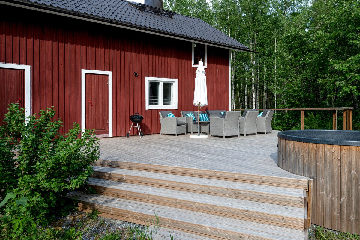 B-side of villa located at Himos. A calm location by the shore. In the summer, dive into the lake from the sauna, and in the winter, you can go skiing on the ice of Patalahti. The entrance floor features a large open-plan kitchen, living room, a WC and two bedrooms. Upstairs, there is a lounge area, a bedroom and a sleeping alcove plus WC. The lowest level has a bedroom, and sauna facilities. The backyard has a jacuzzi (separate reservation). The shore area includes a dock and a BBQ shelter.