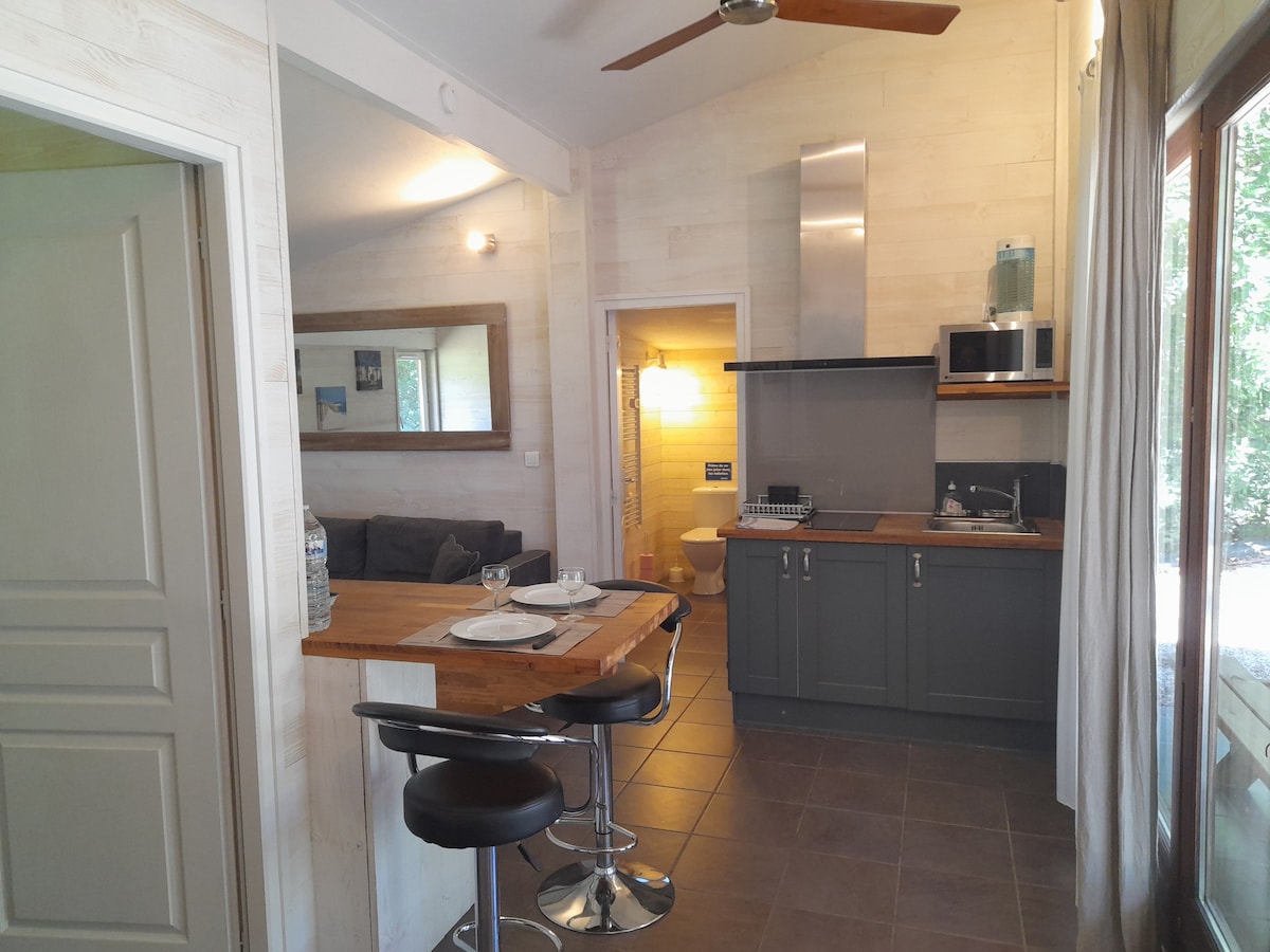 Chalet de 40 m2, lumineux, entièrement équipé et climatisé, avec wifi. - Deux chambres - Cuisine ouverte sur le séjour (lave-vaisselle, micro-onde, cafetière Senseo,bouilloire, four, frigo-congélateur, grille-pain, plaque induction). - Salle de bains avec baignoire relax et WC. En extérieur vous profiterez d'un jardin privé de 250 m2, SPA, terrasse de 50 m2 sans vis-à-vis avec un espace barbecue. Stationnement pour un véhicule. Linges de maison et serviettes de toilettes fournies.