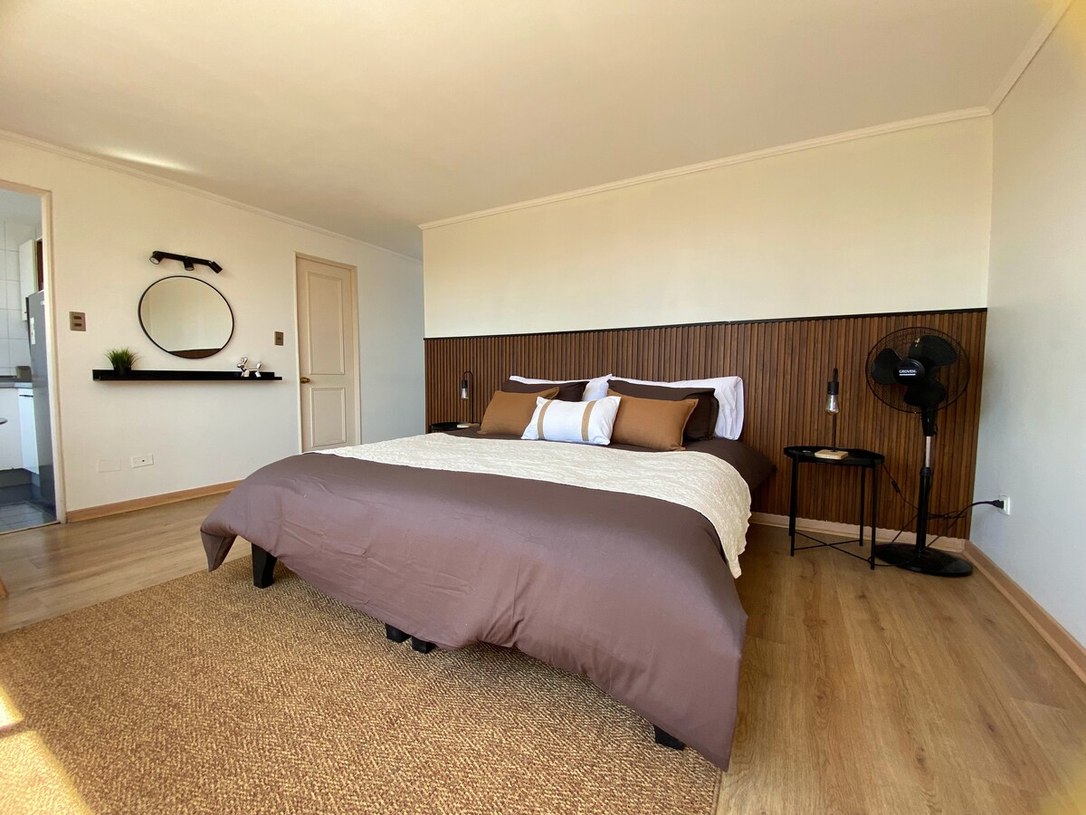 Studio, modern design, ThermoPanel for acoustic and thermal insulation, A/C. Located in the top-rated area in Santiago. Steps away from Tobalaba Metro station, from best restaurants in Santiago, from Costanera Center Mall, cafes and a supermarket. Excellent wifi, free of gas appliances, Cable TV, Smart TV 55" curved screen, nice bathroom. All in a safe neighborhood with many services. For security reasons, it is required to send us, after booking, photos of ID and selfie of each guest.