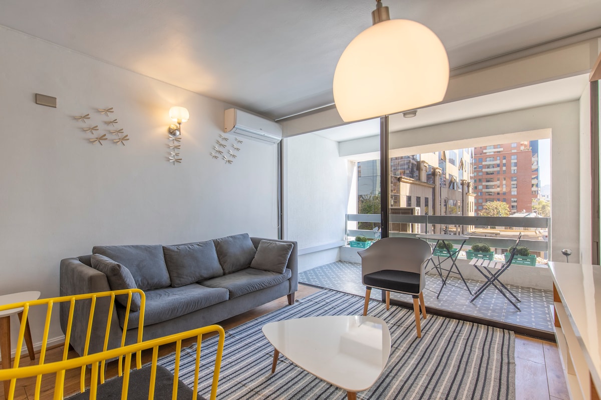 Enjoy a great experience in this save location in Barrio El Golf. Modern and cozy apartment with a privileged location, in the heart of gourmet cuisine and luxury shops of Santiago de Chile "Barrio El Golf". The neighborhood is characterized by its great architectural value and its attractive and varied cultural, gastronomic, and recreational offer. (restaurants, cafes, bars, theaters, museums, design galleries, etc). A few meters away is the metro station ¨Escuela Militar¨ and Plaza Peru.