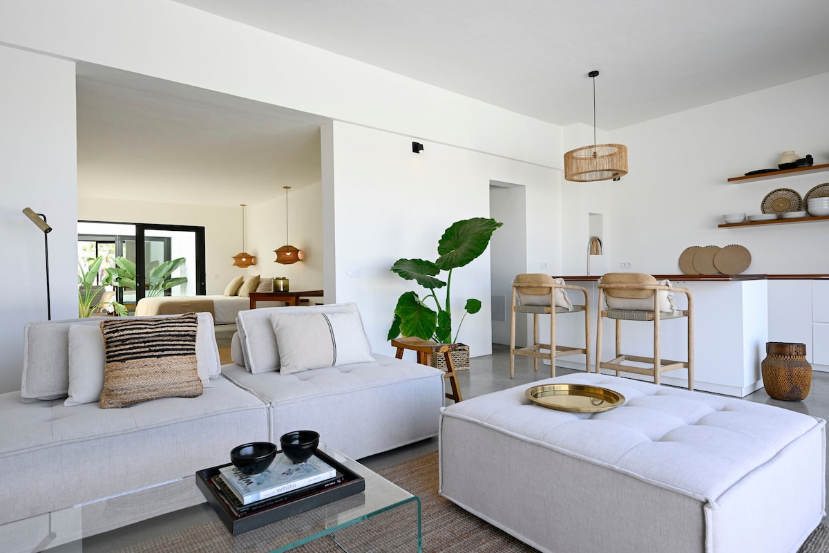 CASA ABORA - just a five-minute walk from one of Fuerteventura’s most spectacular beaches, this light-filled villa is designed as a serene retreat for couples. Minimal and elegant, the open-plan space invites the ocean in through large sliding doors that open onto a west-facing terrace with private pool, chill-out area, and BBQ, perfect for ocean sunsets, al fresco dining, and slow evenings under the stars.