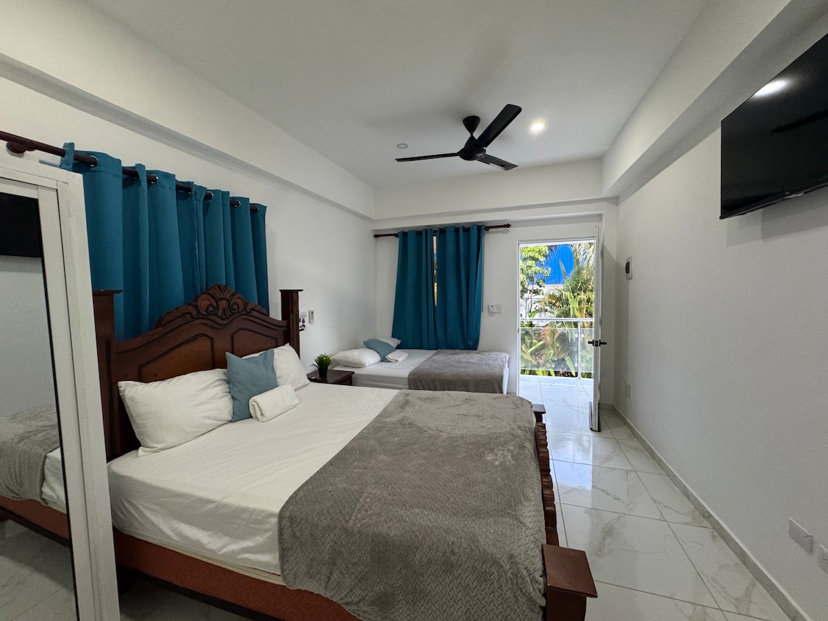 Standardna dvoposteljna soba Svetla, prostorna in vabljiva — naša standardna dvoposteljna soba je kot nalašč za družine, pare ali prijatelje, ki iščejo udobje in lahkotnost le nekaj korakov od plaže. 🛏️ Lastnosti: • dve zakonski postelji • klimatska naprava za vaše udobje • pametna televizija z ravnim zaslonom • Zasebna kopalnica z vročo vodo in gelom za prhanje • Sodobna karibska dekoracija s toplo osvetlitvijo in živahnimi umetninami • brezplačen Wi-Fi