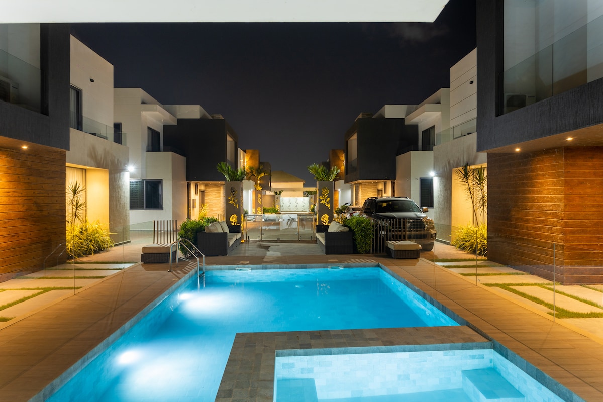 Dobrodošli v zasebnem letovišču v Akri. Nubijska vila ponuja zasebni neskončni bazen, masažno kad s 36 šobami, barom in visečimi stoli, popolnoma opremljeno telovadnico in izbrane kuharske storitve – vse v varnem, luksuznem prenočišču s 4 spalnicami. Vila je zasnovana za družine, vodstvene delavce in zahtevne popotnike. Združuje zasebnost, udobje in brezhibne storitve, vključno s prevozom z letališča in tiho rezervno generatorjem za neprekinjeno napajanje.