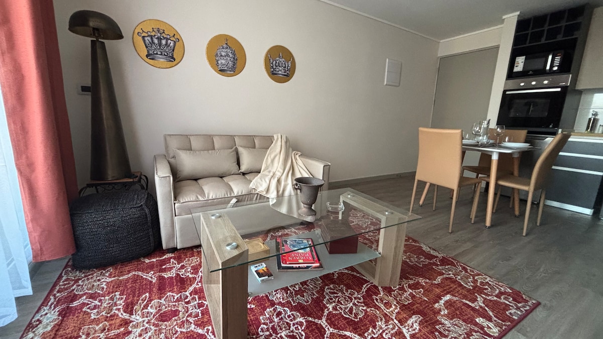 Beautiful new and comfortable apartment on the first floor, with air conditioning and private parking in a very well located building, a few steps from the Plaza Egaña metro station (lines 3 and 4), bus stops, shopping center (Mall Plaza), bars, restaurants, supermarkets, medical center, etc. We can provide a breakfast basket on request (not included in the price).