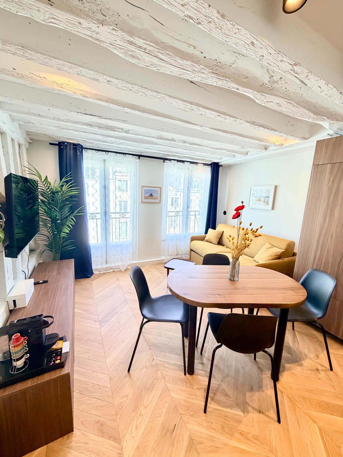 Idéalement situé, en plein cœur du Marais, à l'angle Archives, Francs Bourgeois, Rambuteau. Appartement de caractère, lumineux et calme, 60m2+, 1er étage, typique entresol Marais avec grande baie vitrée À proximité tous Commerces et Transports Salon plein de charme, baigné de lumière: baie vitrée, colonnes, moulures, parquet en chêne Cuisine américaine donnant sur le salon Chambre pour 2 personnes calme donnant sur cour, avec placard-penderie Petite salle de douche avec WC et fenêtre sur Cour