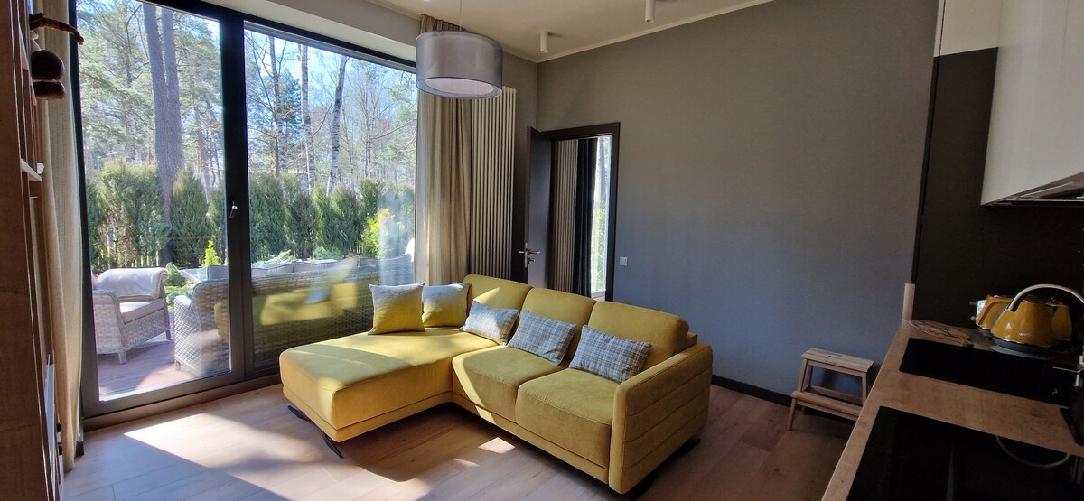 Novo, lepo zasnovano luksuzno stanovanje (75 m2) ima očarljiv vrt (170 m2) s teraso in brezplačnim parkiranjem. Zaljubili se boste v čudovit, sončen pogled na vrt z zunanjim dostopom iz vsake sobe! Stanovanje je dobro urejeno in opremljeno v skladu z luksuznim življenjskim standardom. Nahaja se v mirnem stanovanjskem okrožju Dzintari, le 12 min hoje od plaže in koncertne dvorane Dzintari , 5 min od gozdnega parka Dzintari , 4 min od postaje Dzintari. Popolna povezava do Rige, 25 min z vlakom/avtomobilom.