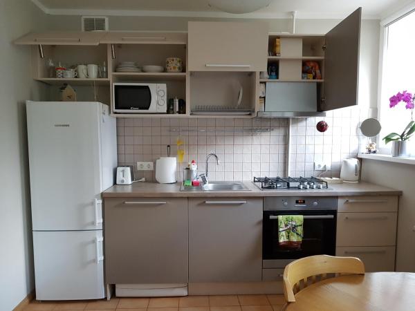 Prostorna garsonjera z balkonom in savno, ki se nahaja v mirni zasebni soseski za 2 odrasla (+ otrok/najstnik). Zgoraj je odprt bivalni prostor v garsonjeri, spodaj pa WC,prha in savna. Ima velika okna, balkon, obrnjen proti drevesi in dvorišču. Štedilnik, hladilnik, kamin, Wi-Fi, brezplačno parkiranje; pralni stroj. 1200 m do središča mesta in kavarn. 700 m do sprehajalnih poti ob reki. Komunikacija v latvijščini in tekoče angleško Na dvorišču sta lahko pes in mačka.