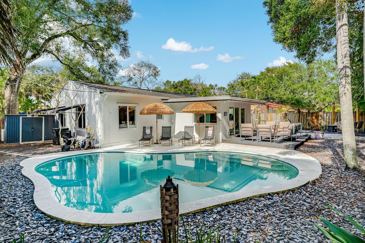 Welcome to Sunhouse, your private pool oasis in the perfect location: just 1 mile from the beach and the Pompano Beach Fishing Village! This house is the perfect Florida escape with everything you need plus the luxury of your own (BIG) heated pool! Relax in the backyard with comfy loungers, adirondack chairs, BBQ, and pool toys. Want to explore? Hop on our bikes for a quick 10-minute ride to one of Florida's best beaches, where you'll find great restaurants & shops!