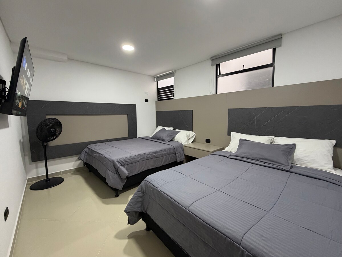 - Sobe z zasebno kopalnico in balkonom, SmarTV, sef in klimatska naprava, Wi-Fi z optičnimi vlakni - Skupni družabni prostori, kot so kuhinja, delovni prostor ter prostor za pranje in sušenje perila - Udobje sob je zasnovano tako, da med številnimi drugimi strateškimi možnostmi vašega bivanja uživa v elegantnem doživetju v tej nastanitvi, ki se nahaja v središču mesta, sosedi ekskluzivnega območja Laureles, nakupovalnih centrih, stadionu, areringu, postajah podzemne železnice in številnih drugih strateških možnosti vašega bivanja.