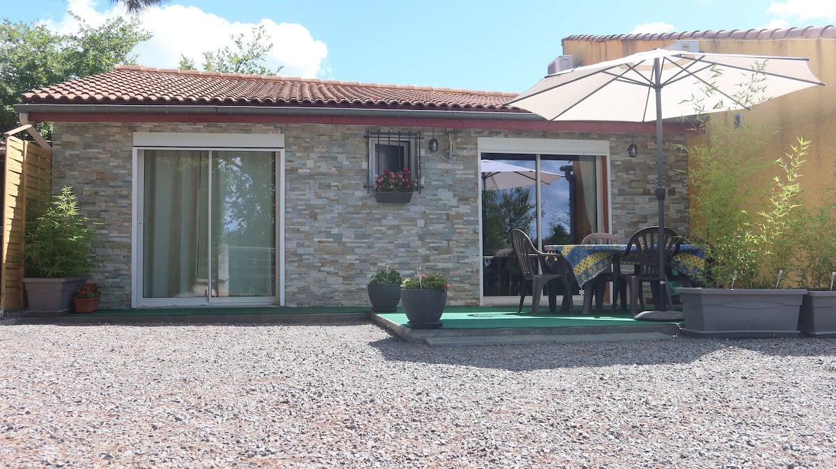 Nova, neodvisna, klimatizirana hiša z varnim zasebnim bazenom. - Velika svetla dnevna soba s popolnoma opremljeno kuhinjo in bivalnim prostorom. - 2 spalnici - 1 ločena kopalnica (prha) / stranišče - Pokrita terasa z jedilnico in prostorom za sprostitev, obrnjena proti jugovzhodu - Popolnoma zavarovan zasebni bazen/ ležalniki - Zasebni dostop in parkiranje IGRIŠČE ZA ŽOGO KAJENJE JE PREPOVEDANO (možnost kajenja na pokriti terasi). Prazniki niso dovoljeni