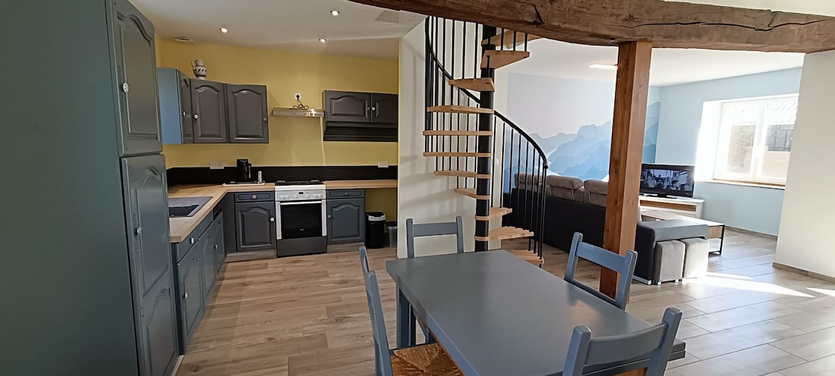 Naša koča/hiška na deželi vas bo z veseljem sprejela, da napolnite baterije v okolju zelenja, obdani z živalmi s podeželja. Naša prostorna in udobna nastanitev vam bo omogočila prijetno bivanje. V starem prenovljenem skednju boste imeli dve spalnici (vključno z eno podstrešje z otroško kočo), veliko dnevno sobo z opremljeno kuhinjo in štedilnikom na drva za toplo vzdušje, ki bo osvetljeno ob vašem prihodu. Postelje bodo prav tako pripravljene.
