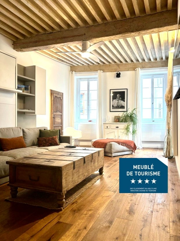 ⭐⭐⭐⭐ Stanovanje s postrežbo s 4 zvezdicami Ah, Rue Sainte Claire!!!! Nahaja se v osrčju starega mestnega jedra in boste bivali v prostornem stanovanju s površino56m2. Lokacija je popolnoma peš, zato se lahko sprehodite med številnimi ulicami, prepustite se očarljivosti srednjeveških fasad rožnatih, zelenih in rumenih barv, pa tudi kosite na terasi ene od številnih restavracij v senci pod arkadami. Ampak ... to že veste... prav